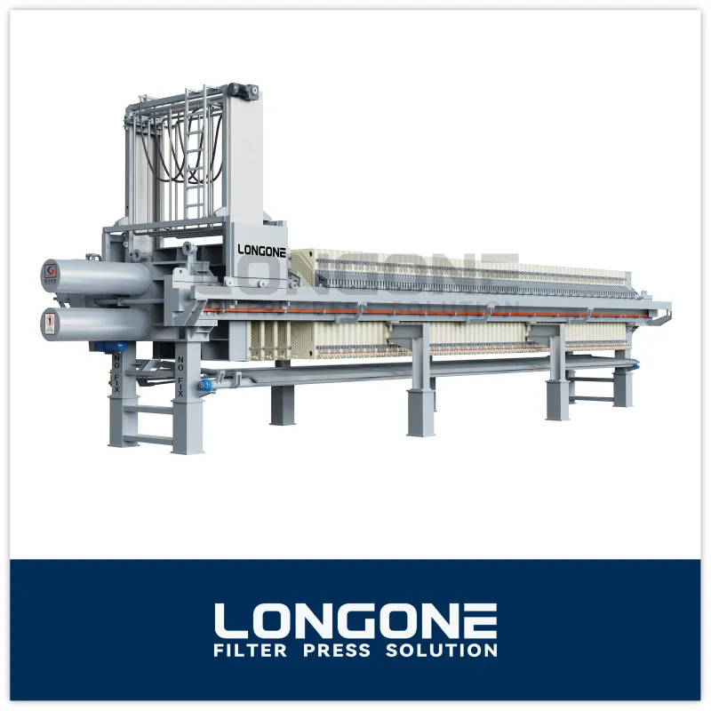 4、Прессование: Когда камеры заполнены, фильтровальные плиты сжимаются, оказывая давление на осадок. Это позволяет удалить оставшуюся жидкость из осадка.